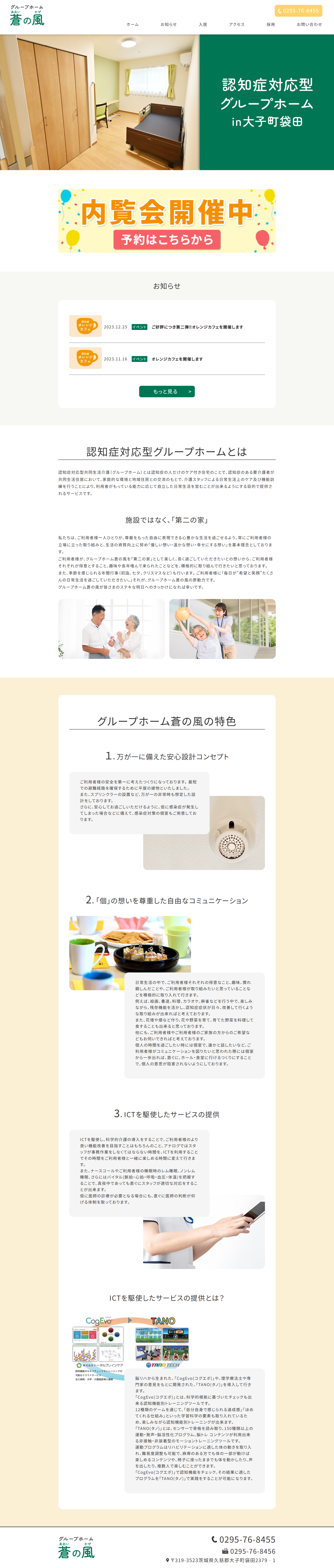 施設の特徴や認知症ケアの考え方を分かりやすく伝えるコンテンツ設計。内覧会情報を目立つ位置に配置し予約を促進。
