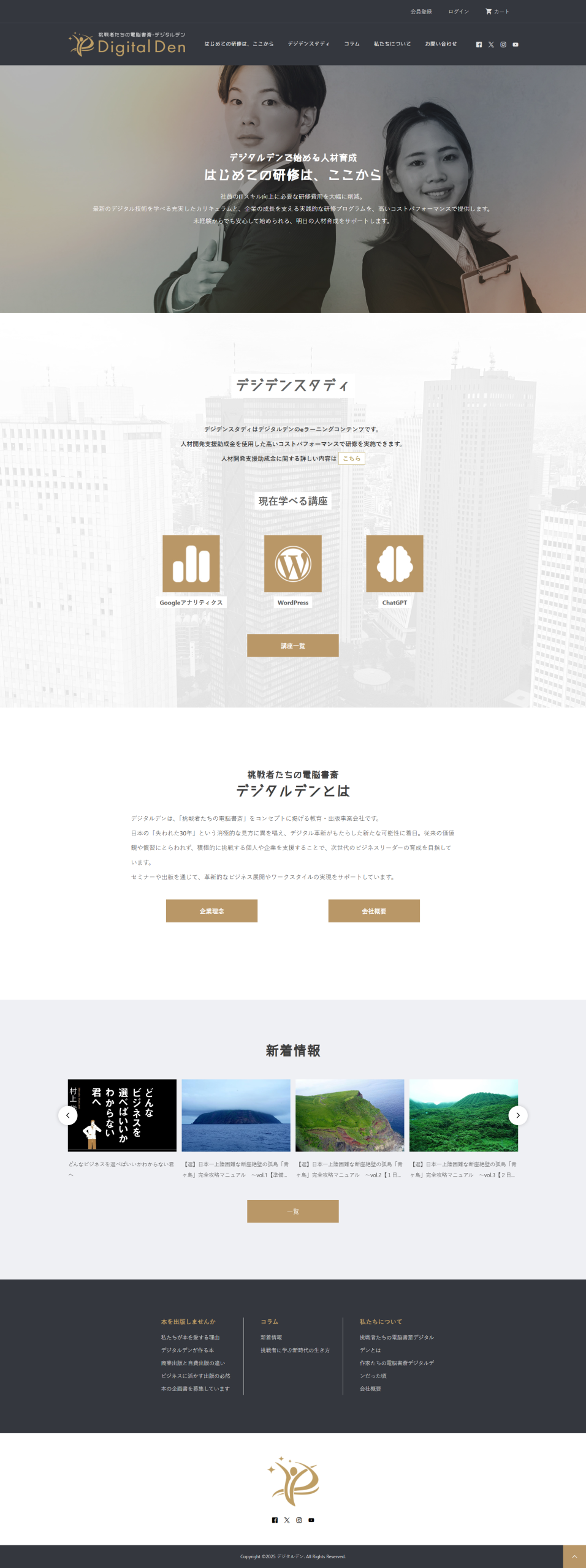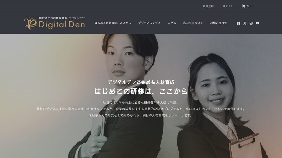 A website for personnel development and training services that balances trustworthiness and innovation. Creates a professional impression with sophisticated gold and black/white color scheme. Visually presents training curricula (WordPress, Google Analytics, ChatGPT, etc.) in an easy-to-understand format. Adopts content design that concisely conveys company philosophy and training features to enhance potential clients’ understanding. Also implemented a blog function to share the latest information.