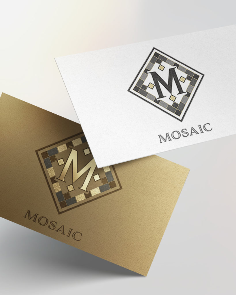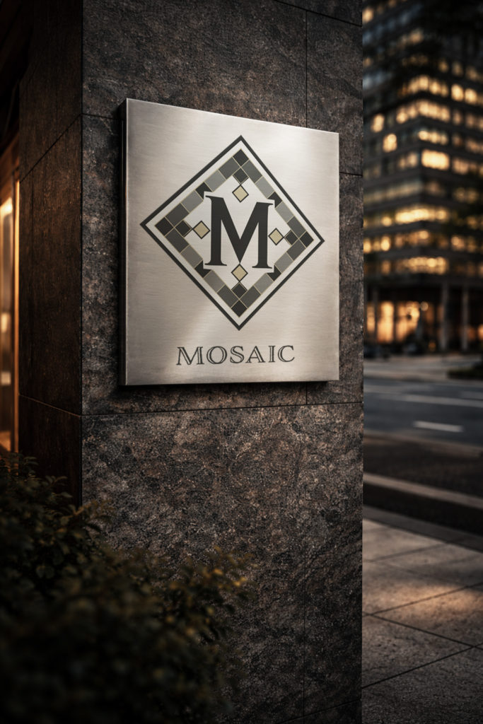 A brand logo inspired by mosaic tiles. A mosaic tile pattern is arranged within a diamond-shaped frame and seamlessly integrated with a central “M,” creating a design that intuitively conveys both the brand name and a refined sense of luxury.