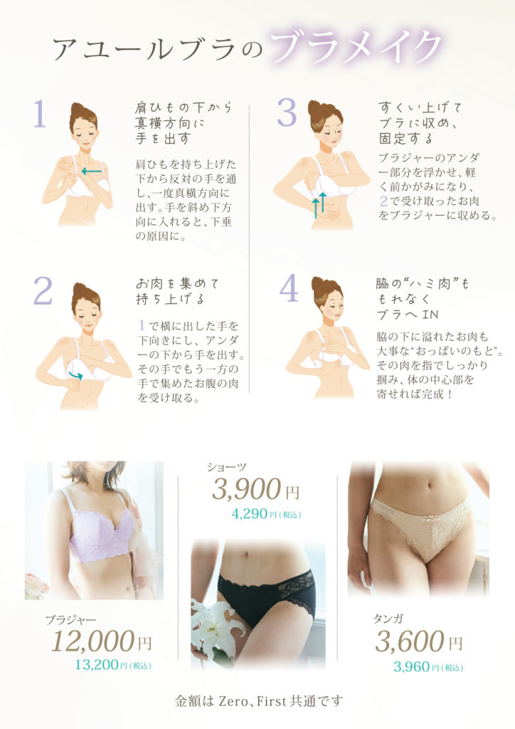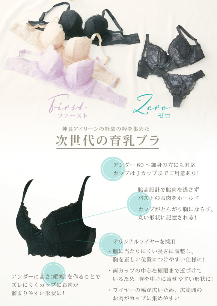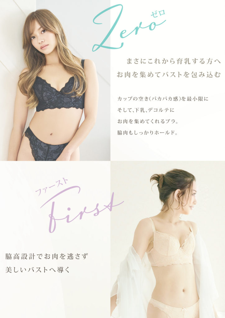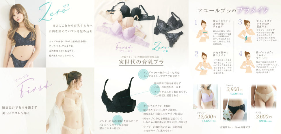 淡く優しいパステルカラー、繊細なイラストと丁寧なタイポグラフィで、「次世代の育乳ブラ」が持つ革新性と安心感を同時に表現しています。