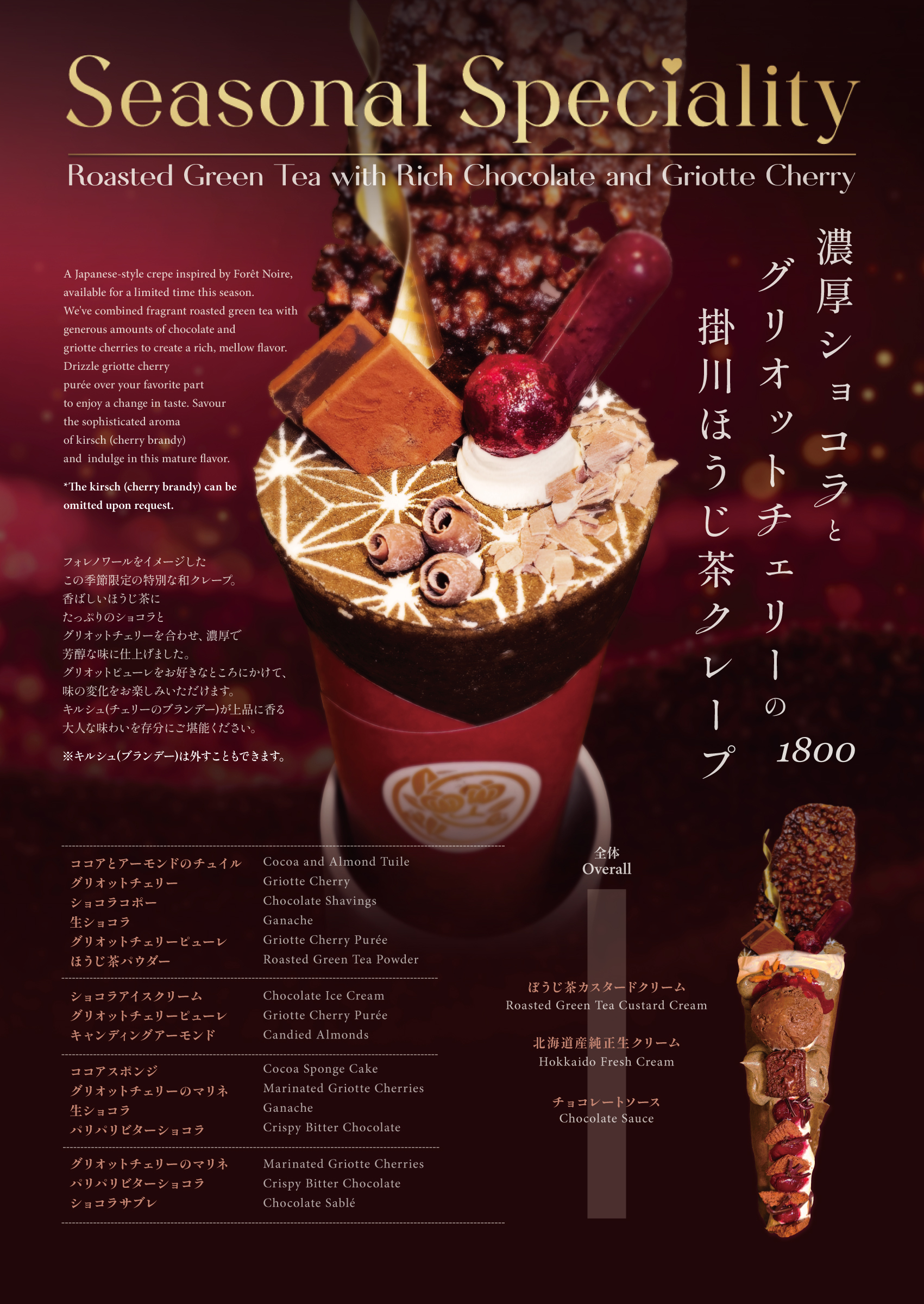 A poster design for a limited-time menu item at a premium Japanese crepe specialty shop. Inspired by Forêt Noire, the design expresses the fusion concept of roasted green tea, rich chocolate, and griotte cherries—a harmonious blend of Japanese and Western elements.